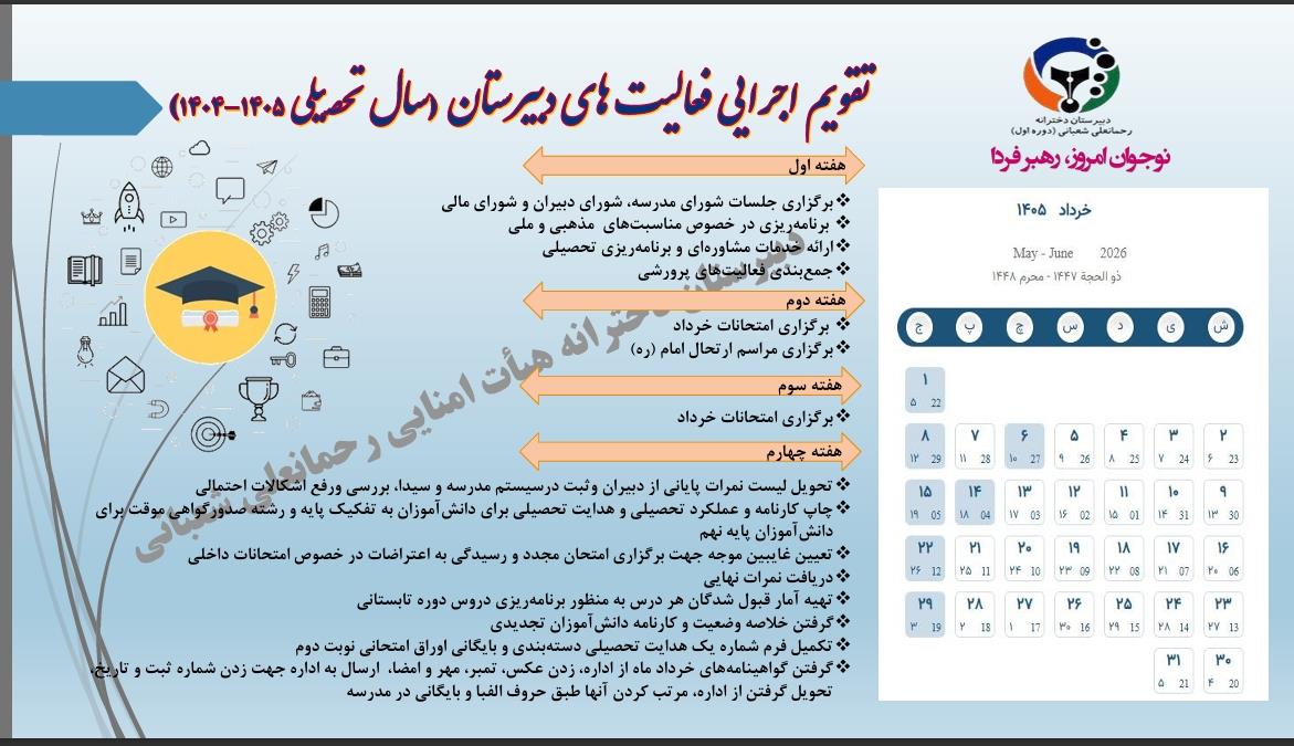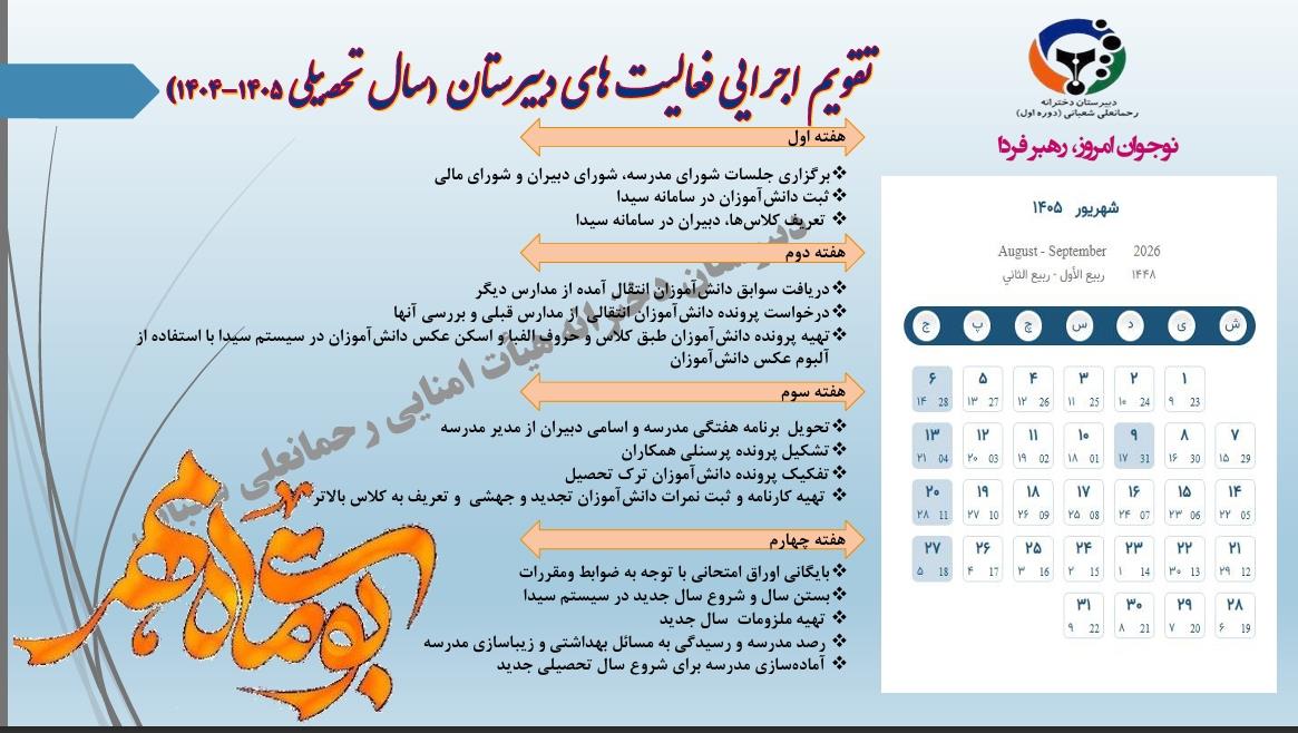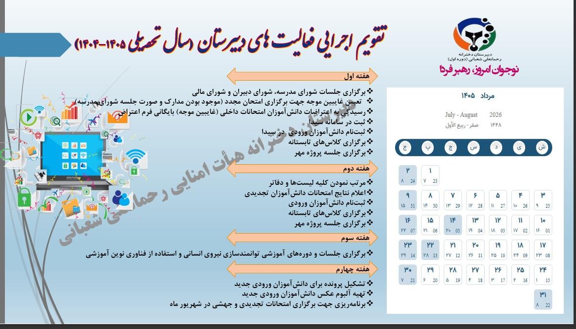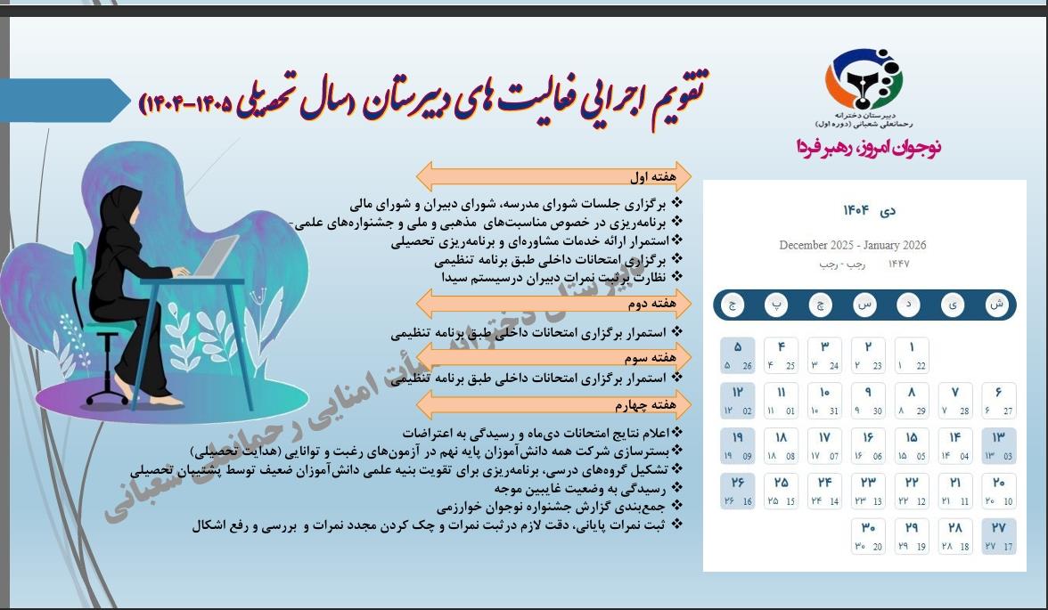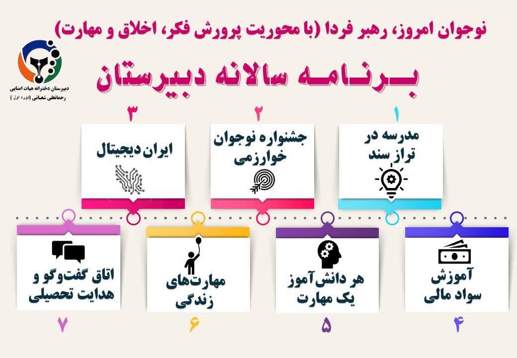 شعار مدرسه : نوجوان امروز، رهبر فردا (با محوریت پرورش فکر اخلاق و مهارت)