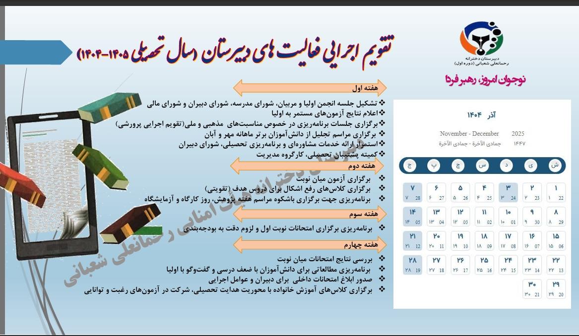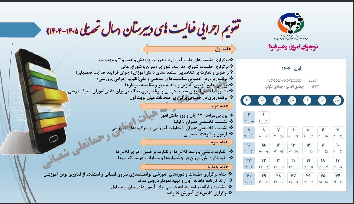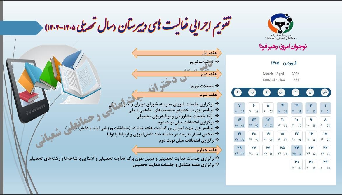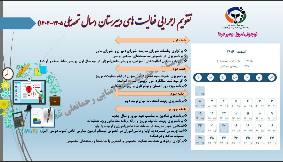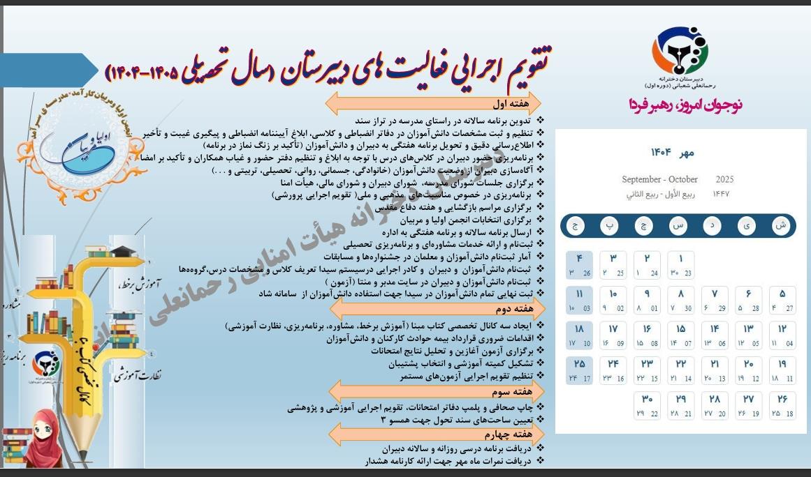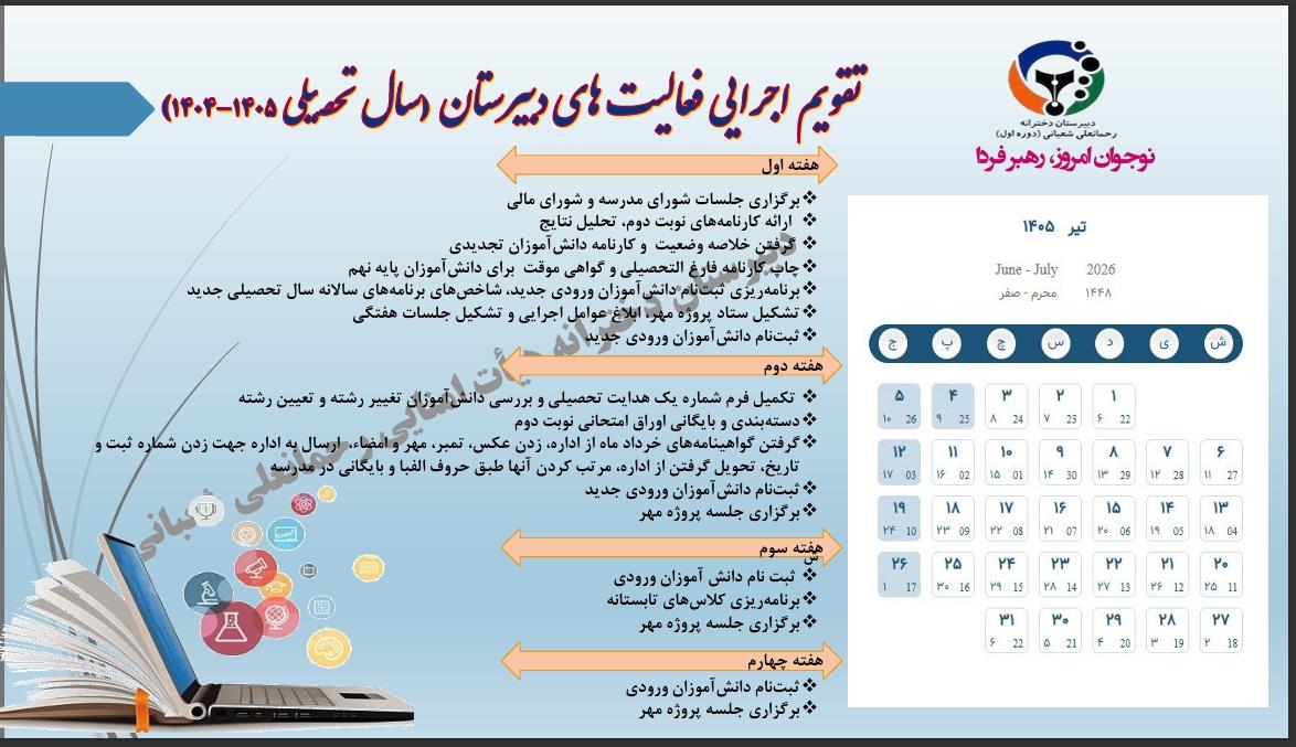 شعار مدرسه : نوجوان امروز، رهبر فردا (با محوریت پرورش فکر اخلاق و مهارت)